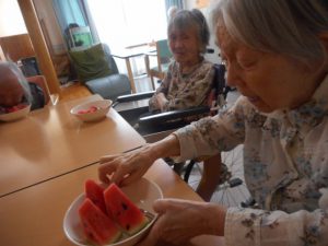 鶴ヶ島 スイカ割り ツイート 8月30日に鶴ヶ島暖家2階にてスイカ割りを行ないました。 昼食は暑い時期が続く中、夏バテ予防にぴったりなウナギを提供しました。 とても皆さんの好きな味付けだったみたく昼食中は箸がとまることが無かったです。 デザートで召し上がるスイカを入居者様に割って頂きました。 女性はスイカのビーチボールで行い、男性は本物のスイカで行いました。 全員で協力しどうやったら割れるかを考え、見事にスイカが割れました。皆さんで冷えた甘いスイカを召し上がりました。 最初のいいね!ボタンをどうぞ。 いいね! いいね!を取り消す 2018年9月6日