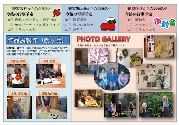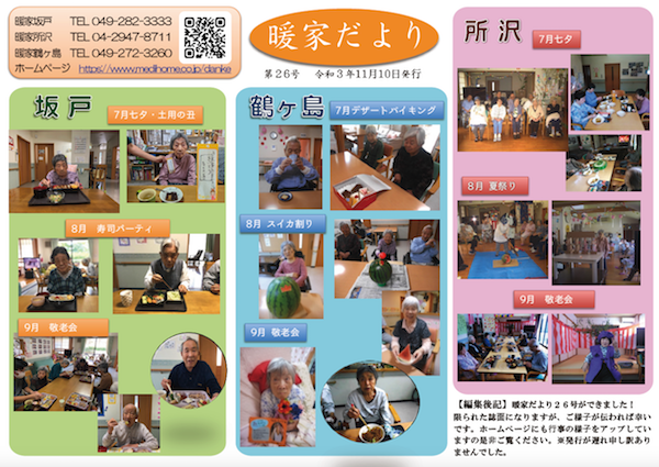 暖家だより26号が出来上がりました。 埼玉県、坂戸市・鶴ケ島市・所沢市の暖家3施設での利用者様の様子をお伝えしている「暖家だより」の第26号が完成いたしました。 今回は2021年の7〜9月のホームの様子を掲載しています。 裏面には、暖家鶴ヶ島で行われた合同作品展の作品作りの様子と、おもて面に載せきれなかった写真も入っています 限られた紙面ではありますが、グループホームでの生活の様子が少しでもお伝えできればと思っています。 最初のいいね!ボタンをどうぞ。 いいね! いいね!を取り消す 2021年11月17日