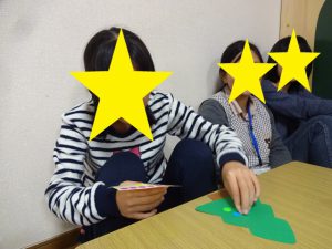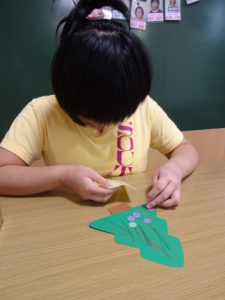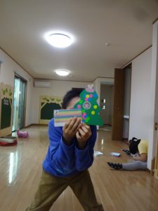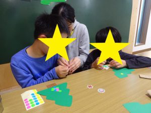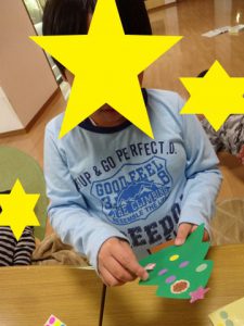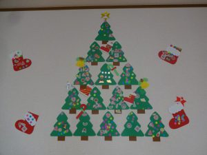 クリスマス制作をおこないました クリスマスに向けて、みんなで壁面作りを行いました。 ツリーの形に切った画用紙にシールを貼ります。 かわいいシールがたくさん。 どれを貼ろうか迷っちゃうね ひとりひとつずつ、クリスマスツリーを飾り付けます。 こちらはサンタのブーツを作っています 完成! みんなが作った小さなツリーで、大きなツリーが出来上がりました! クリスマスが楽しみですね。 2018年12月10日