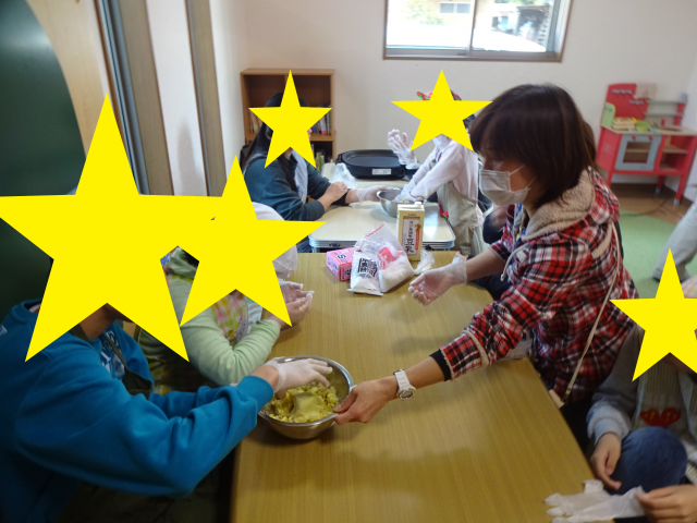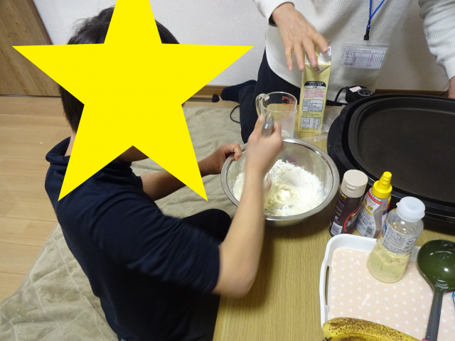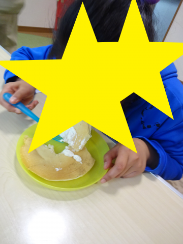 春休みの活動~おやつ作り~ 春休み中、アメリカンドックや、いももち、ホットケーキ等たくさんの美味しいおやつを作りました!! ホットケーキ作り♪ 生地をまぜまぜ… ホットプレートで焼いて 上手くひっくり返せたかな!? 美味しいホットケーキが出来ました♪ いももち編 ゆでたサツマイモを皆でつぶして ホットプレートで焼きます。 やけどしないようにそーっと 焼きあがったら、そのままいただきます。 サツマイモの自然な甘さがあってとても好評でした!! 2019年4月26日