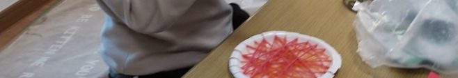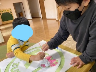 くり抜いたロゴの中を絵具でカラフルに仕上げました!