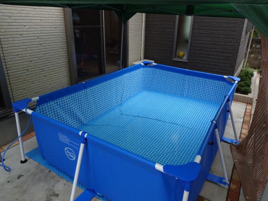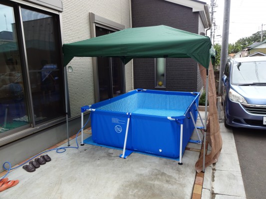 夏といえばプール!!っということでホントはプールに利用者を連れて行きたかったのですが、いろいろな面を考えると今年は断念せざるを得ず、でも「水遊びしたいよね」のスタッフの思いから今年は市販のプールを準備してきずなの敷地内で水遊びを行うことに☆*:.。. o(≧▽≦)o .。.:*☆