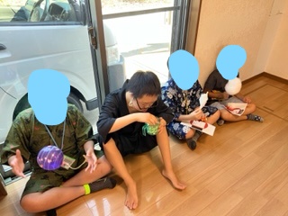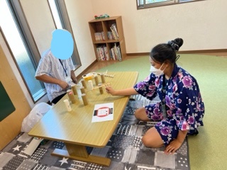 他にも、みんなで協力して作った割り箸てっぽうでの射的やヨーヨー、くじ引きゲームなども行っています( *´艸`)
