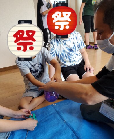 射的で使う割りばし鉄砲を作ったり、飾り付けのうちわの絵を描いたり