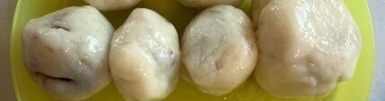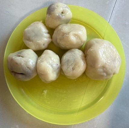 4センチくらいのボールにし、平たくつぶし、あんこ玉を乗せて包みます