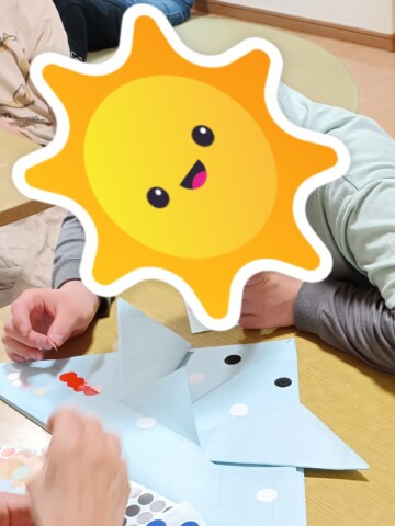 別の日には大きな紙を、みんなで折って大きな「かぶと」を作りました。