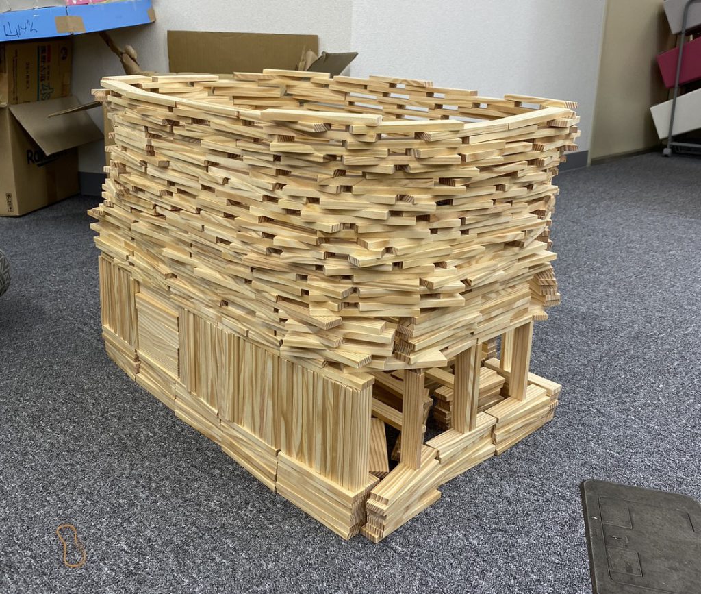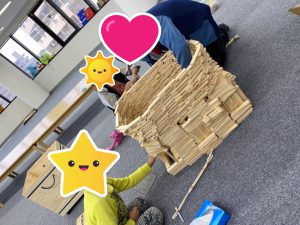 上のお写真では、「大きい建物をつくろう!」という子どもたちの提案がどんどんスケールアップし、最終的には「コロッセオ」をイメージした超巨大作品へと仕上がりました!
