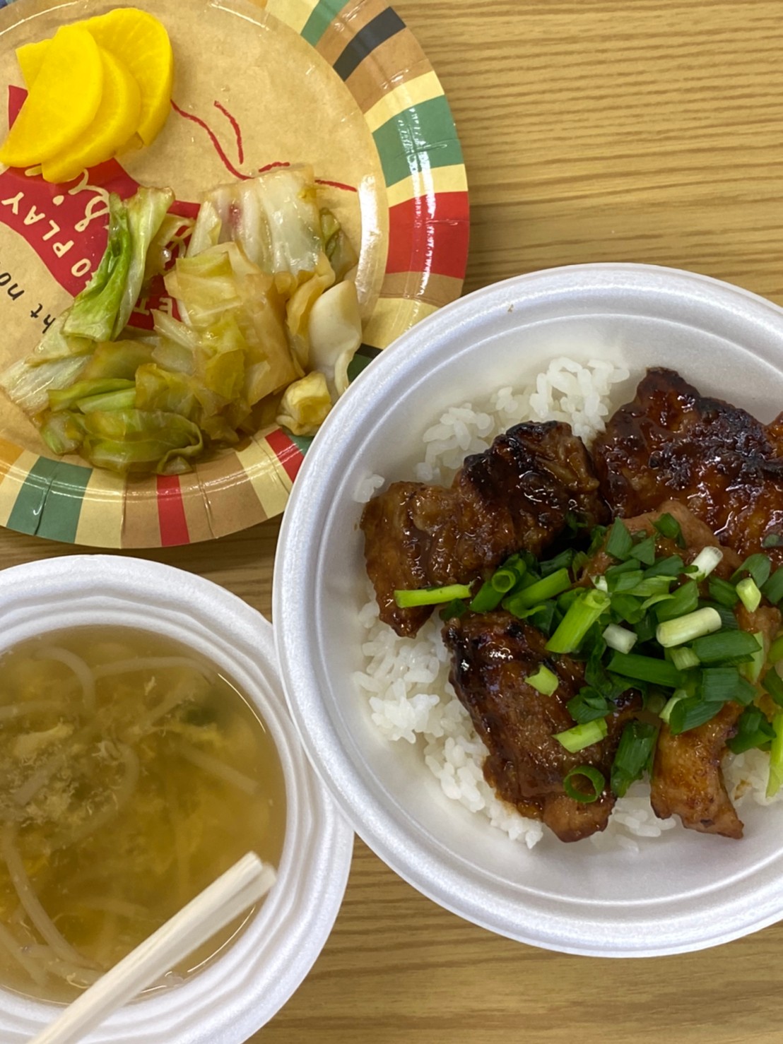 付け合わせにキャベツとたくあん、事前に作っておいたスープもつけました!