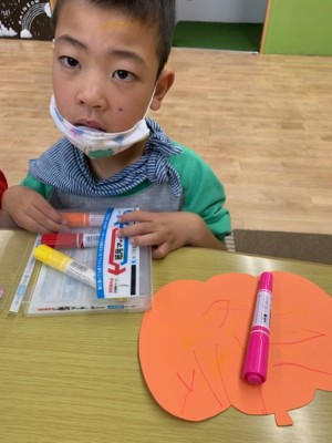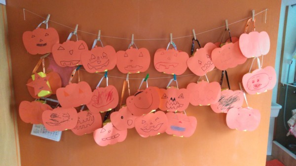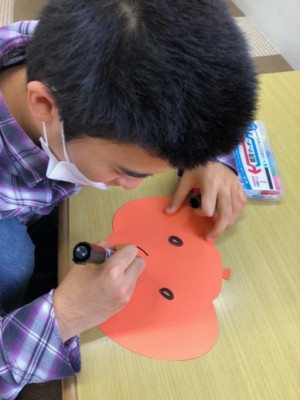 スタッフがあらかじめ、画用紙をかぼちゃ型に切っておき、そこにジャック オア ランターンの顔を子ども達が書いていきます✨星やハート型の画用紙も用意し、そこには自分の顔や、家族の顔、好きなキャラクターなど思い思いに好きな絵を書いてもらいました🎵