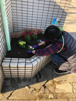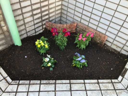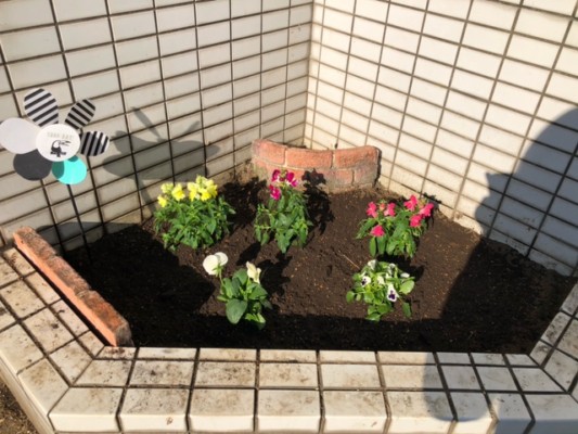 トイス駐車場入り口の花壇には、スタッフが、ビオラとパンジーを植えました🌼