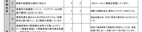 | 業務改善 | 4 | 業務改善を進めるためのPDCAサイクル(目標設定と振り返り)に、広く職員が参画しているか | 7 | 職員会議の他、日常で意見の聞き取りなど行われている。 | ||